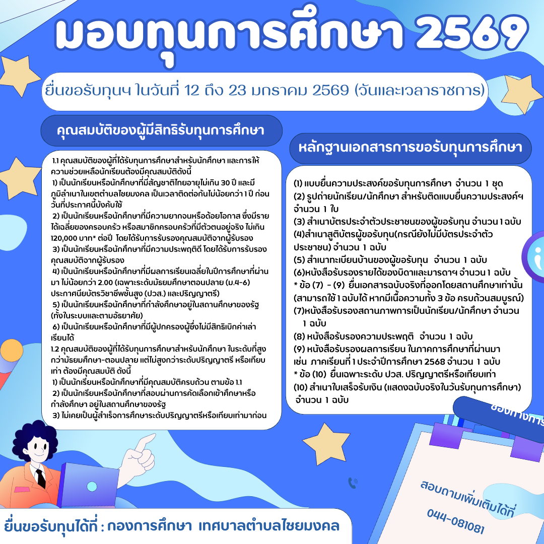 การยื่นความประสงค์ขอรับทุนการศึกษา สำหรับนักศึกษาและการให้ความช่วยเหลือนักเรียน ของเทศบาลตำบลไชยมงคล ประจำปีงบประมาณ พ.ศ. 2569
