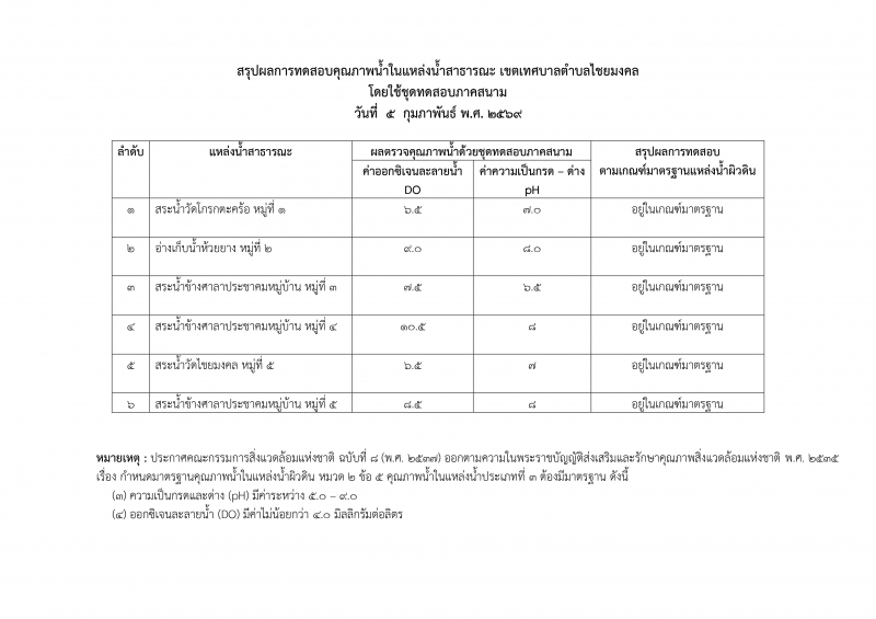 วันที่ 5 กุมภาพันธ์ 2569 กองสาธารณสุขและสิ่งแวดล้อม ดำเนินการเก็บตัวอย่างน้ำจากแหล่งน้ำสาธารณะในพื้นที่ตำบลไชยมงคล จำนวน 6 แห่ง และใช้ชุดทดสอบภาคสนามในการทดสอบคุณภาพน้ำ โดยดัชนีชี้วัดสำคัญ 2 รายการ คือ ตรวจวัดค่าออกซิเจนละลายน้ำ (DO) และค่าความเป็นกรด - ด่าง (pH) ซึ่งผลการทดสอบคุณภาพน้ำทั้ง 6 แห่งอยู่ในเกณฑ์มาตรฐานคุณภาพน้ำในแหล่งน้ำผิวดิน