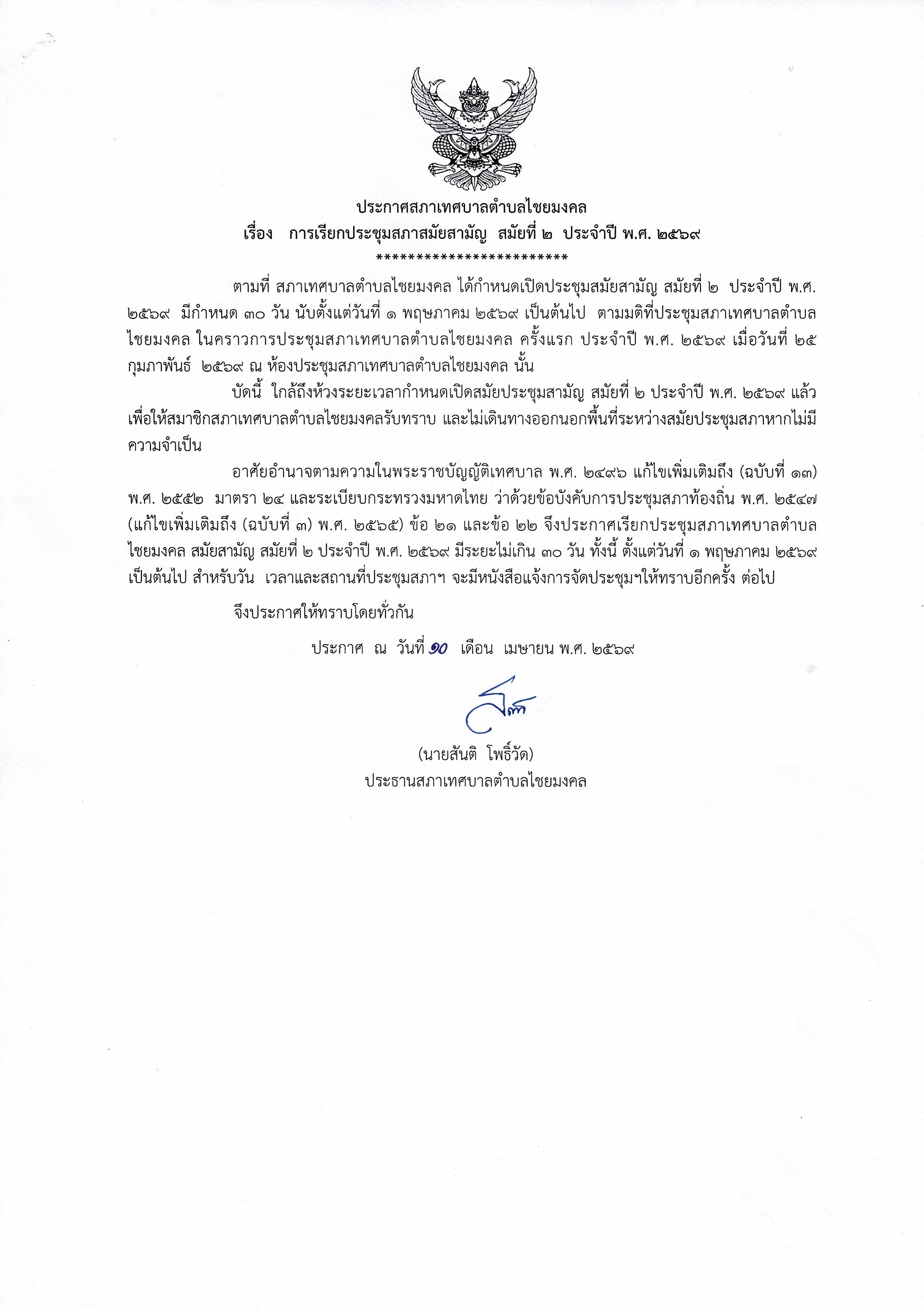 ประกาศสภา ทต.ไชยมงคล เรื่องการเรียกประชุมสภาสมัยสามัญ สมัยที่ 2 ประจำปี พ.ศ. 2569 |