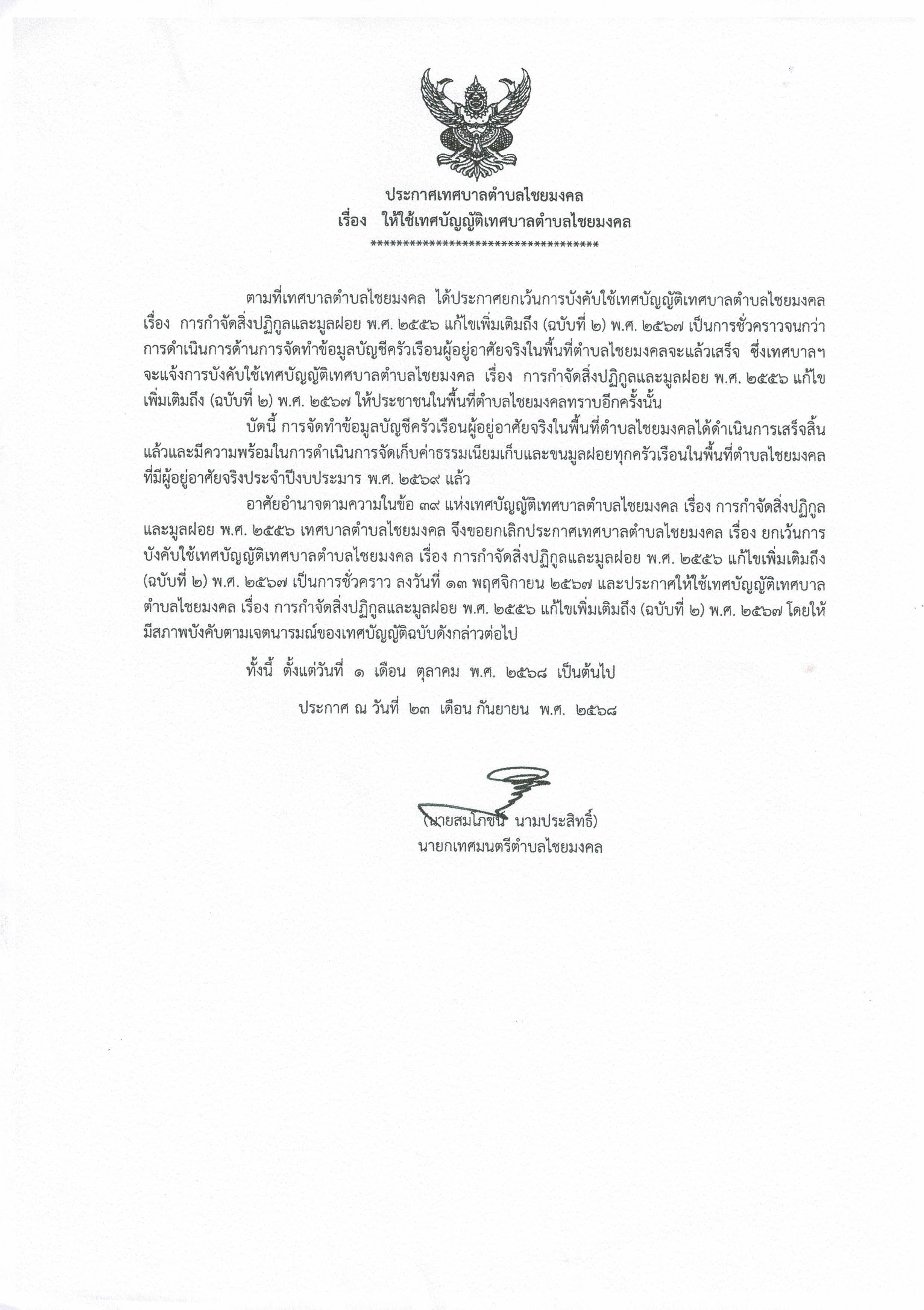 เทศบัญญัติเทศบาลตำบลไชยมงคล เรื่อง การกำจัดสิ่งปฏิกูลและมูลฝอย พ.ศ. 2556 แก้ไขเพิ่มเติมถึง (ฉบับที่ 2) พ.ศ. 2567