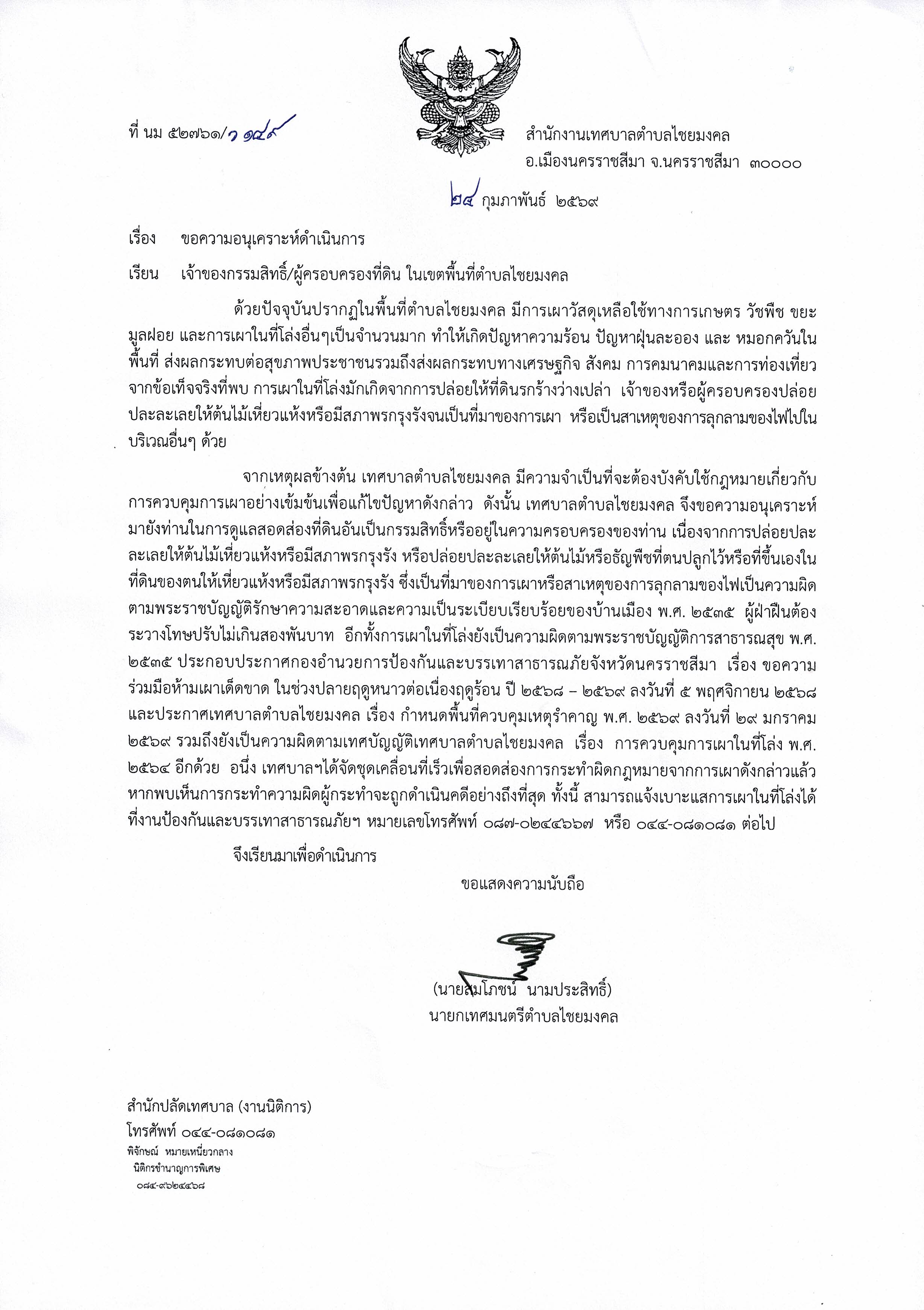 ขอความอนุเคราะห์เจ้าของหรือผู้ครอบครองที่ดิน ในเขตพื้นที่ตำบลไชยมงคล